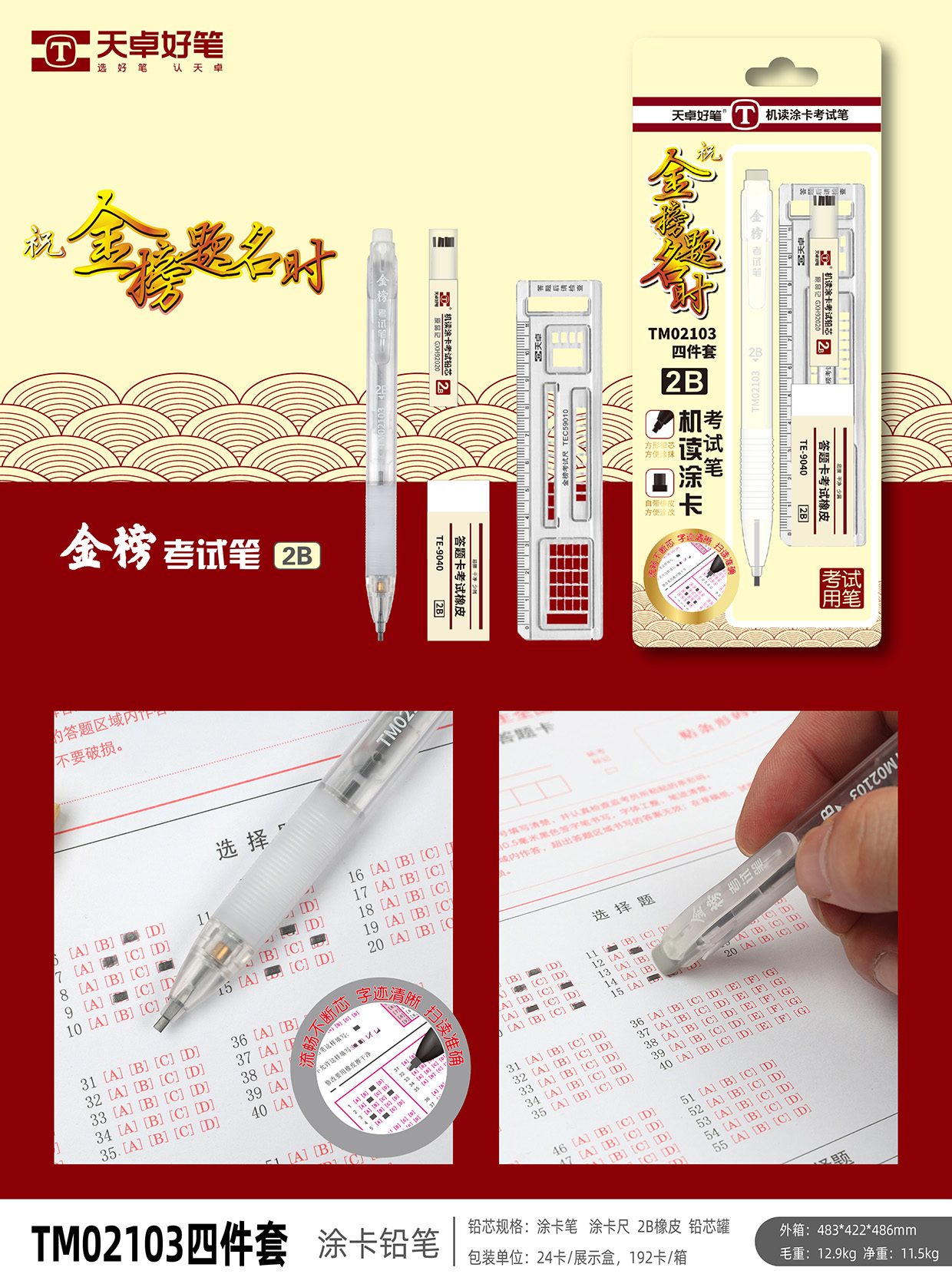 TKT63870天卓考试套装系列 一套考完全部科目。包括中性笔2支、中性笔芯2支、涂卡铅笔1支、涂卡铅芯1盒、涂卡套尺1套、2B考试橡皮擦1块、圆规1个、圆规铅芯1个、考试垫板1张。