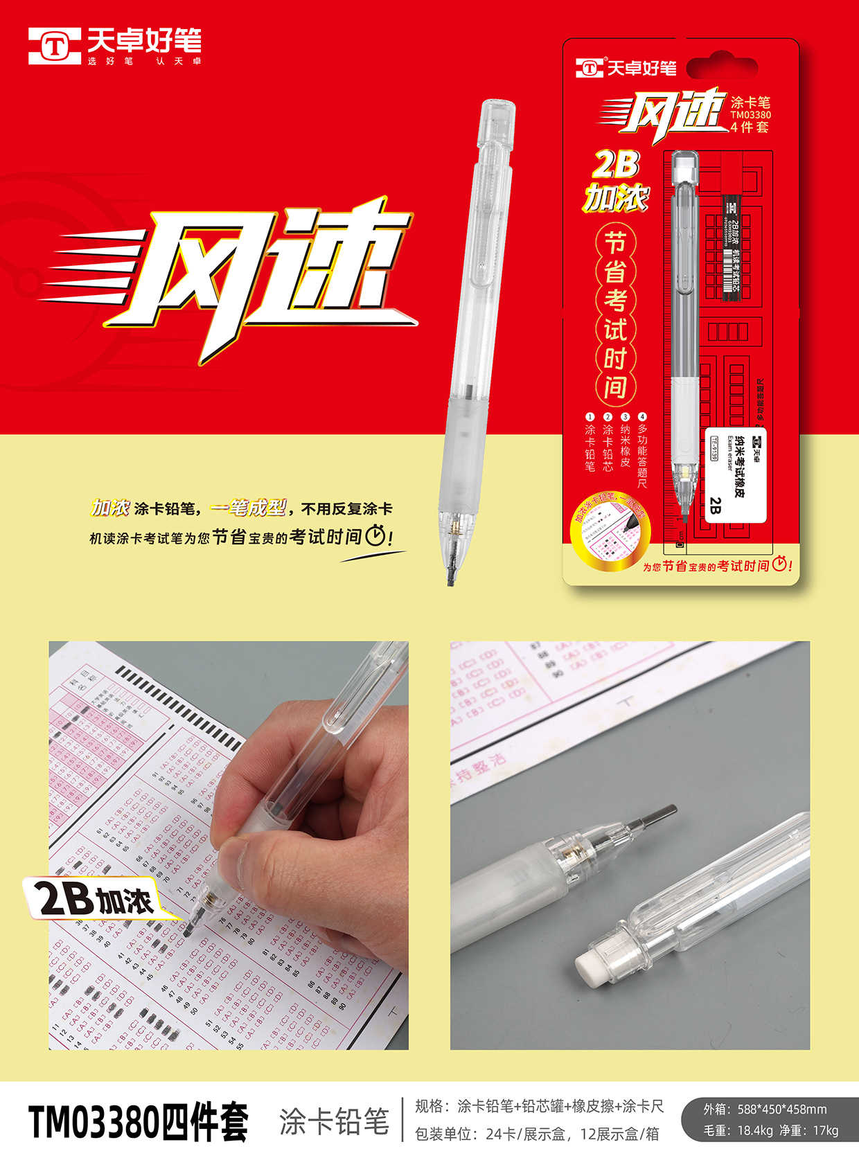 TKT63880一套考完全部科目。包括中性笔2支、中性笔芯2支、涂卡铅笔1支、涂卡铅芯1盒、涂卡套尺1套、2.0活动铅笔1支、涂卡套装1套、2B考试橡皮擦1块。