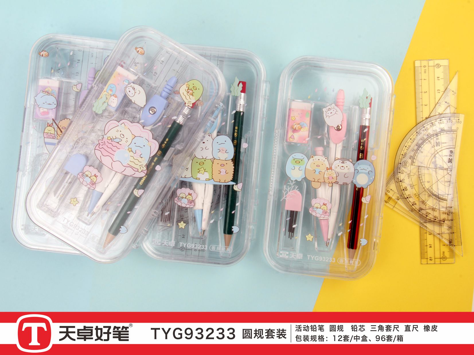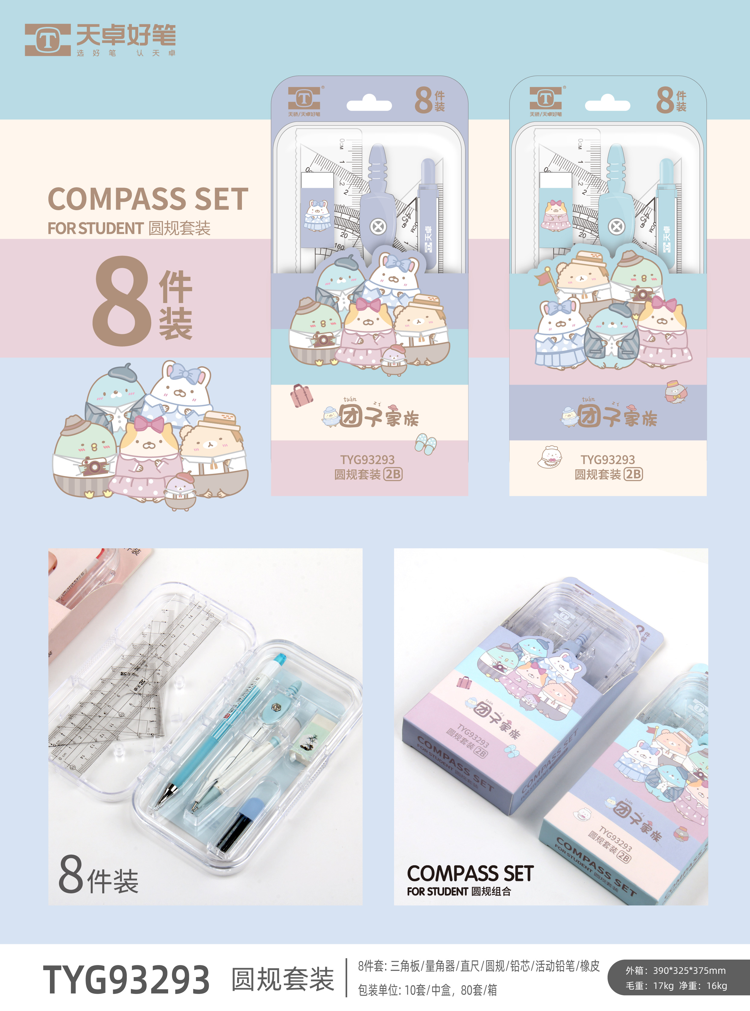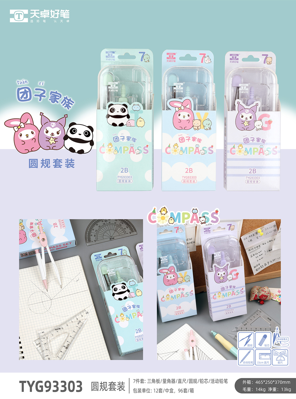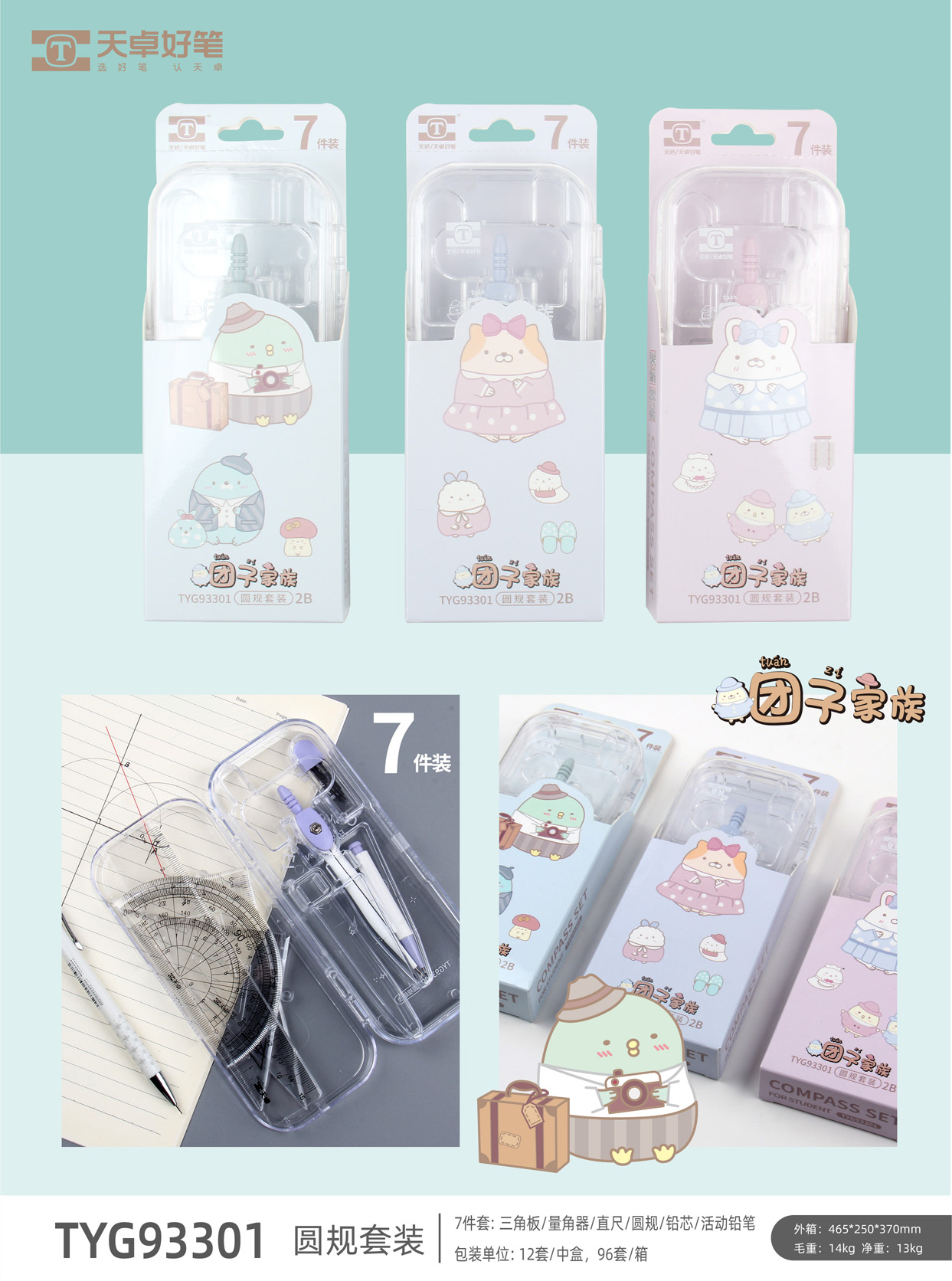 TYG93233天卓 团子家族 系列 圆规大套装,圆规、三角尺、橡皮擦、活动铅笔、铅芯,海洋团子卡通。
