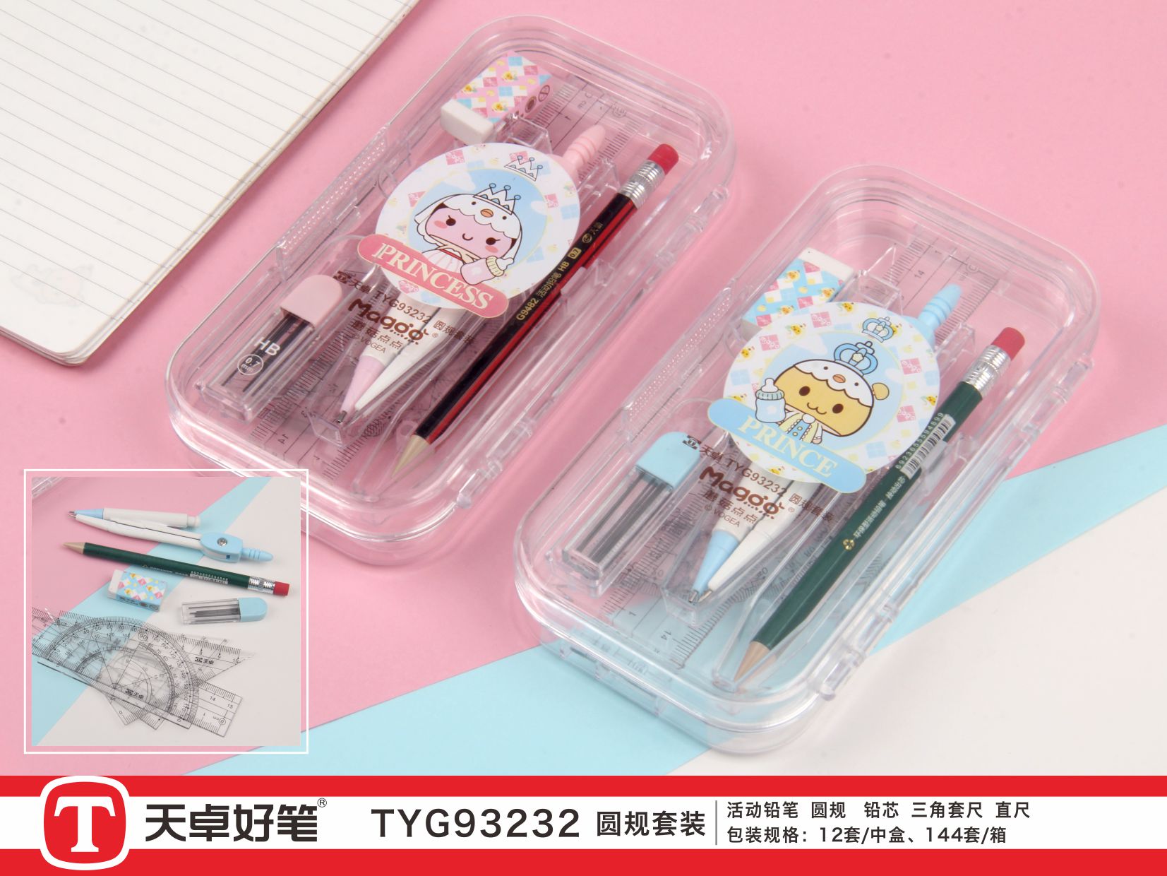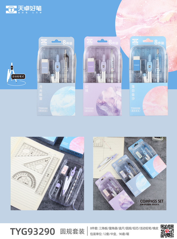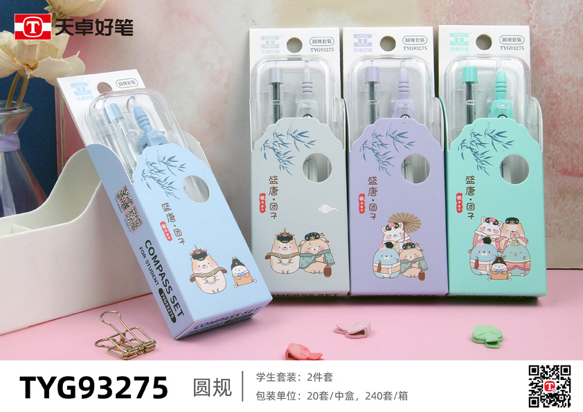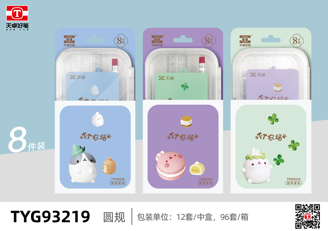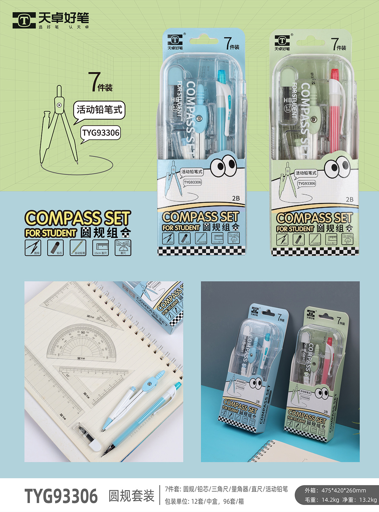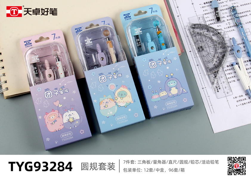 TYG93233天卓 团子家族 系列 圆规大套装,圆规、三角尺、橡皮擦、活动铅笔、铅芯,海洋团子卡通。
