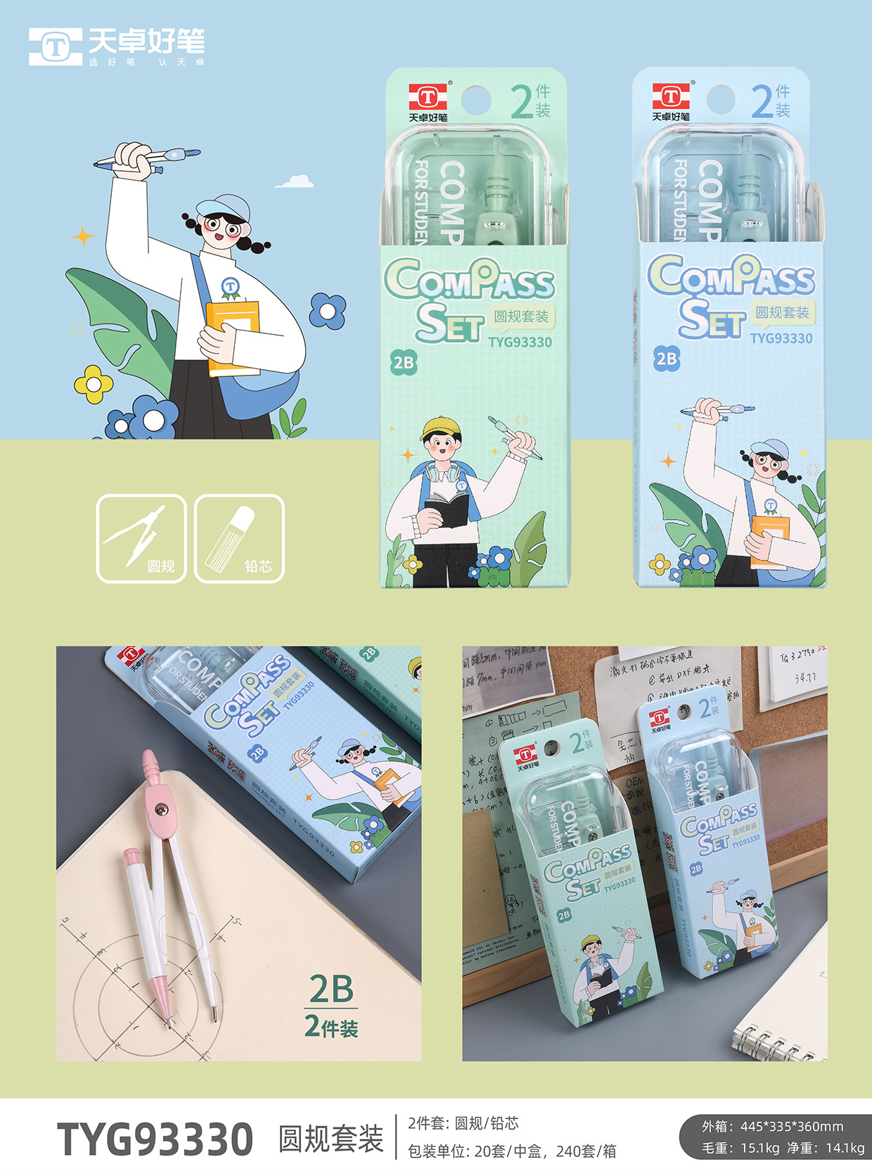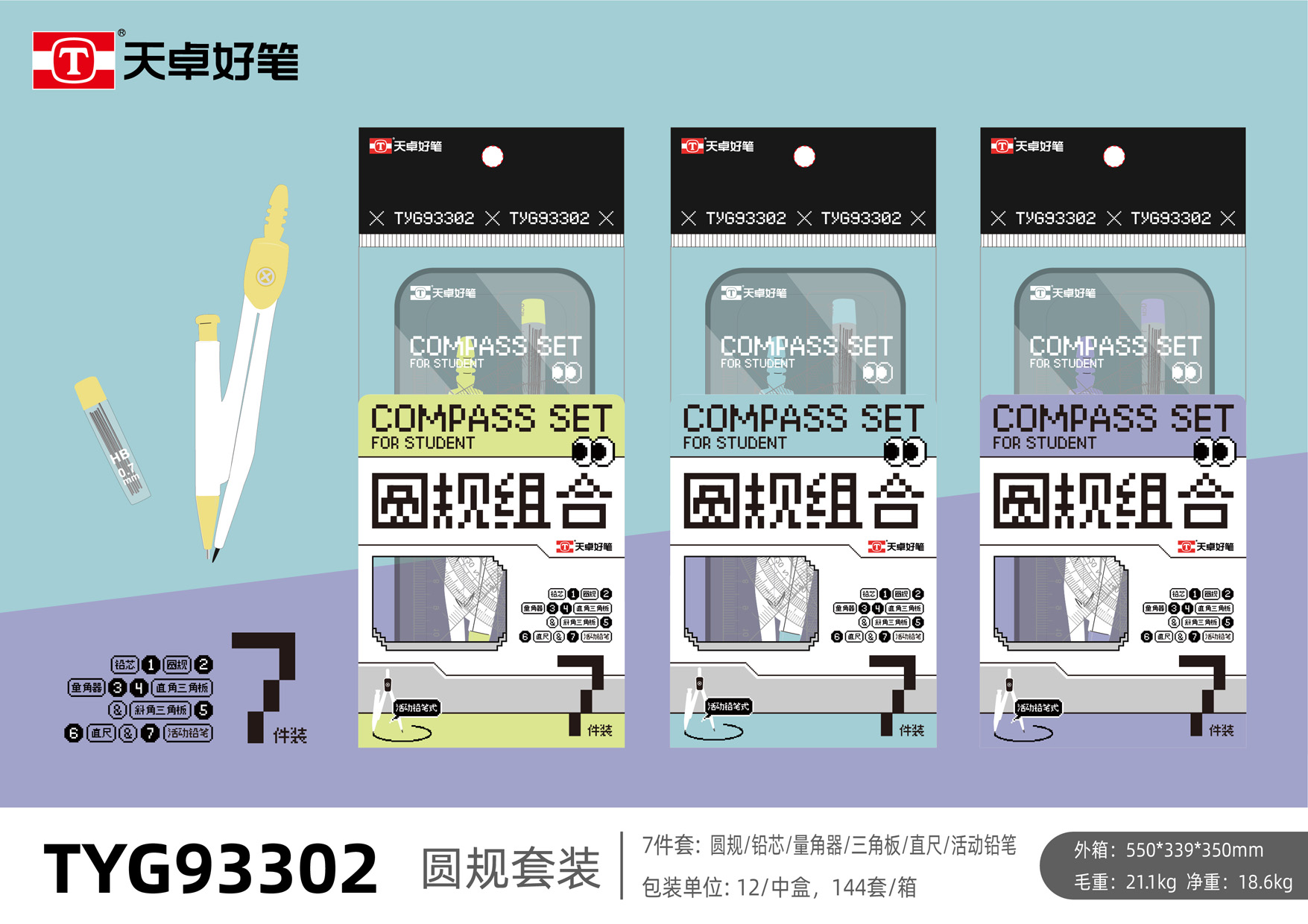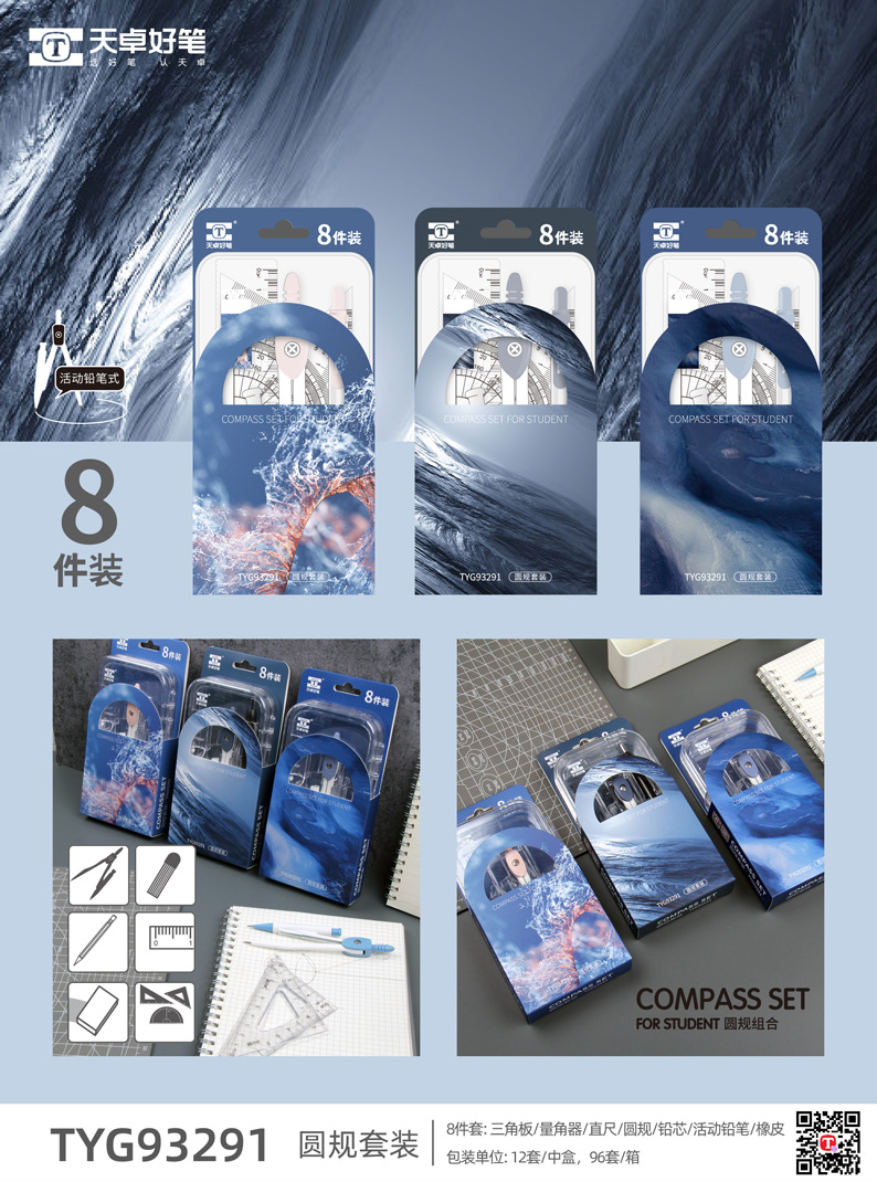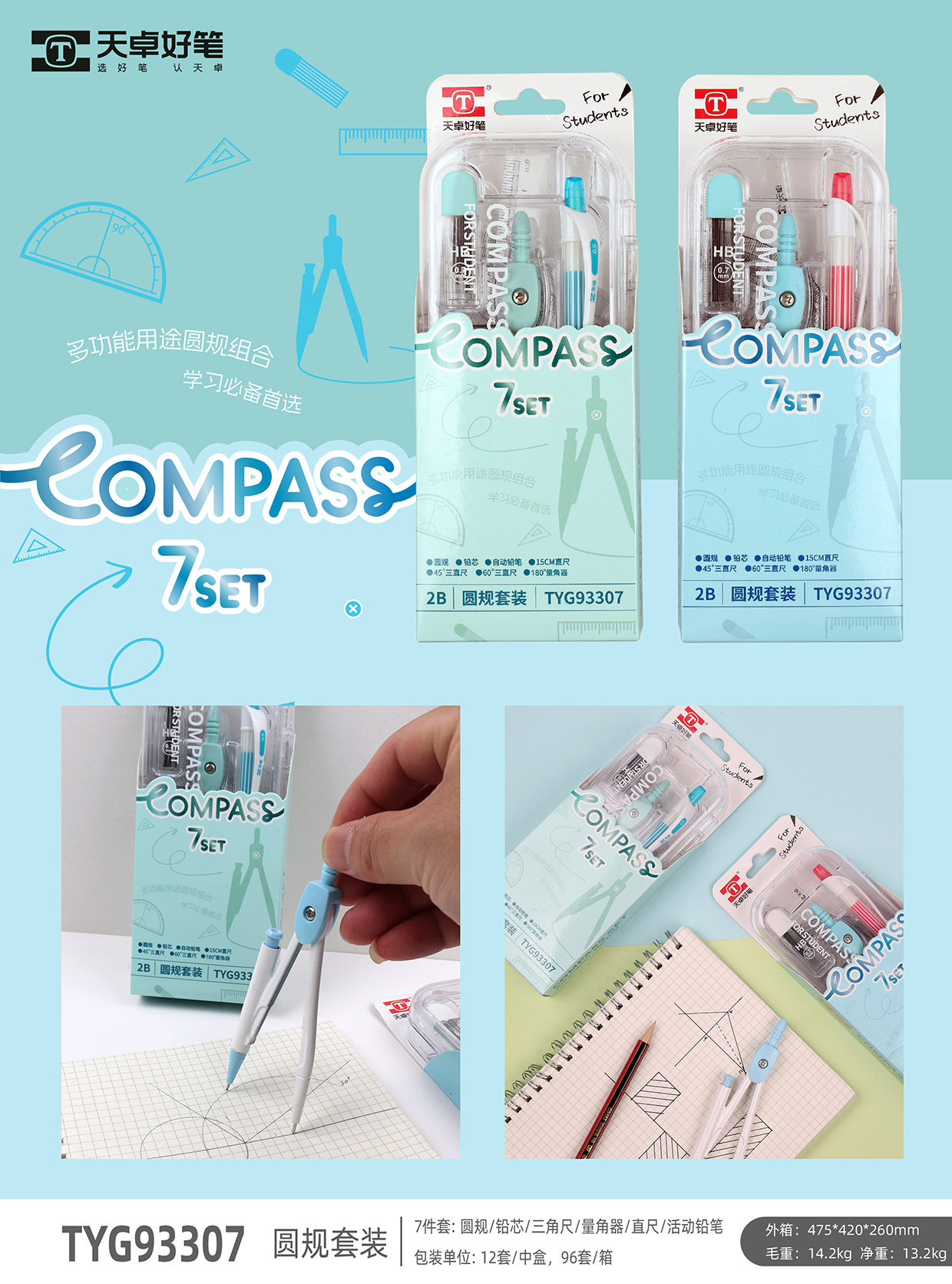 TYG93233天卓 团子家族 系列 圆规大套装,圆规、三角尺、橡皮擦、活动铅笔、铅芯,海洋团子卡通。