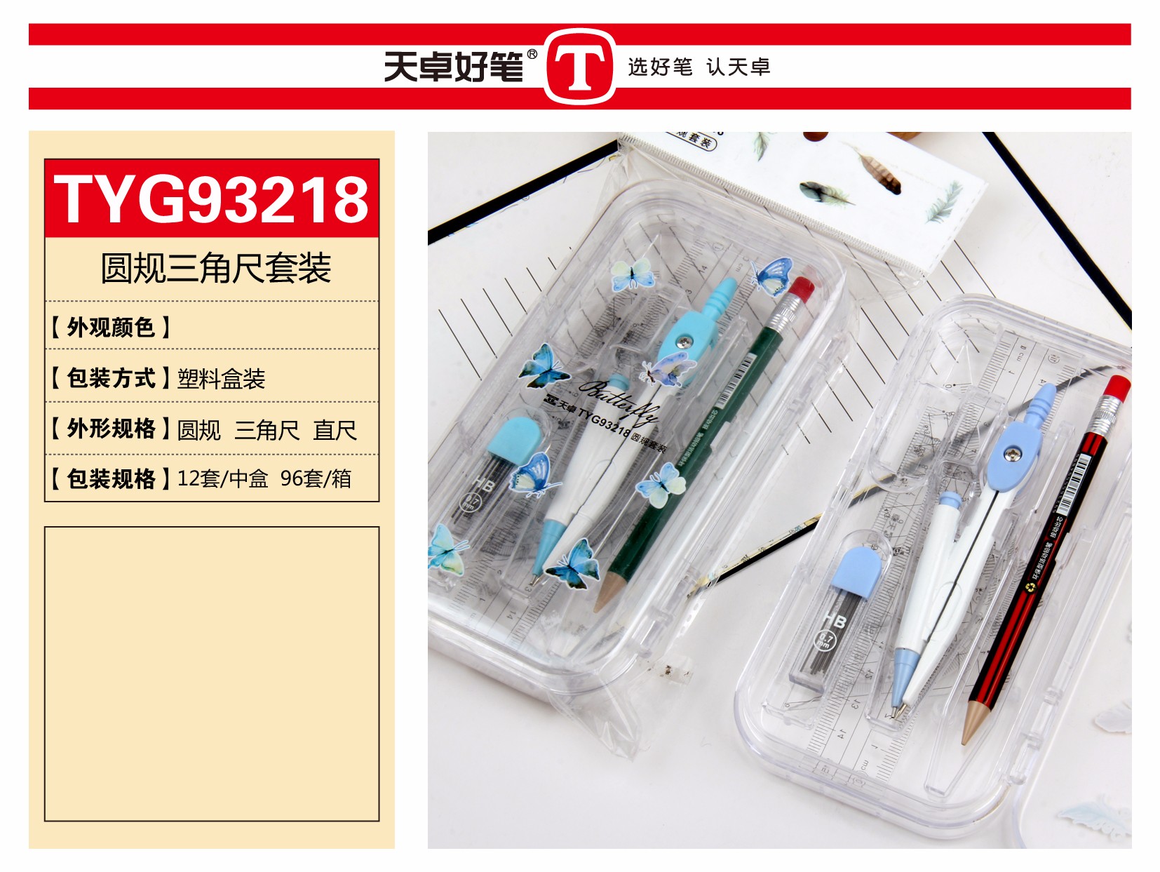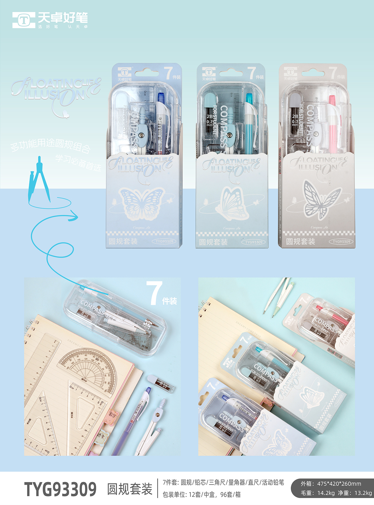 TYG93218天卓 圆规三角尺套装,圆规、三角尺、直尺。蝴蝶、羽毛等小清新时尚图案