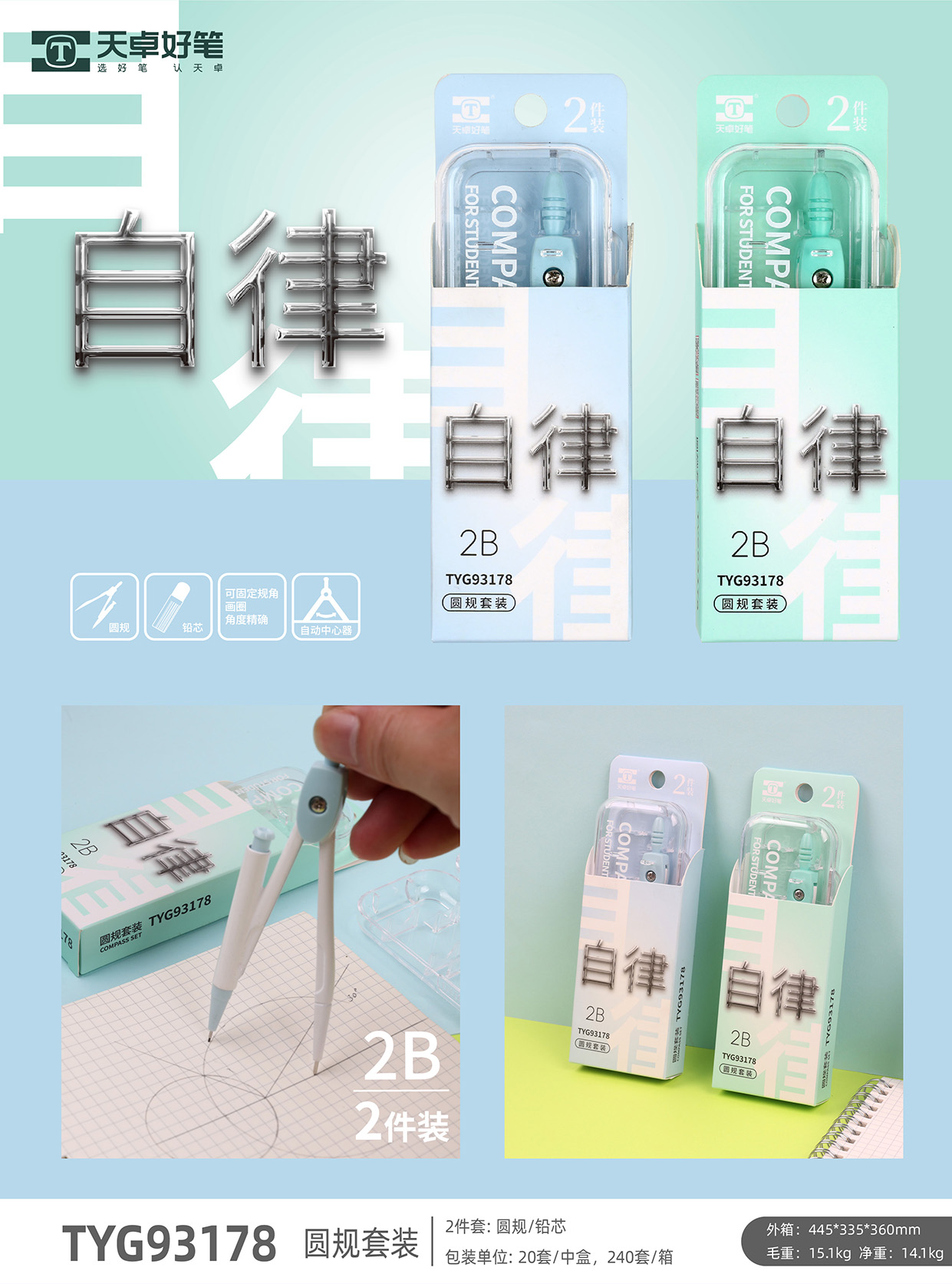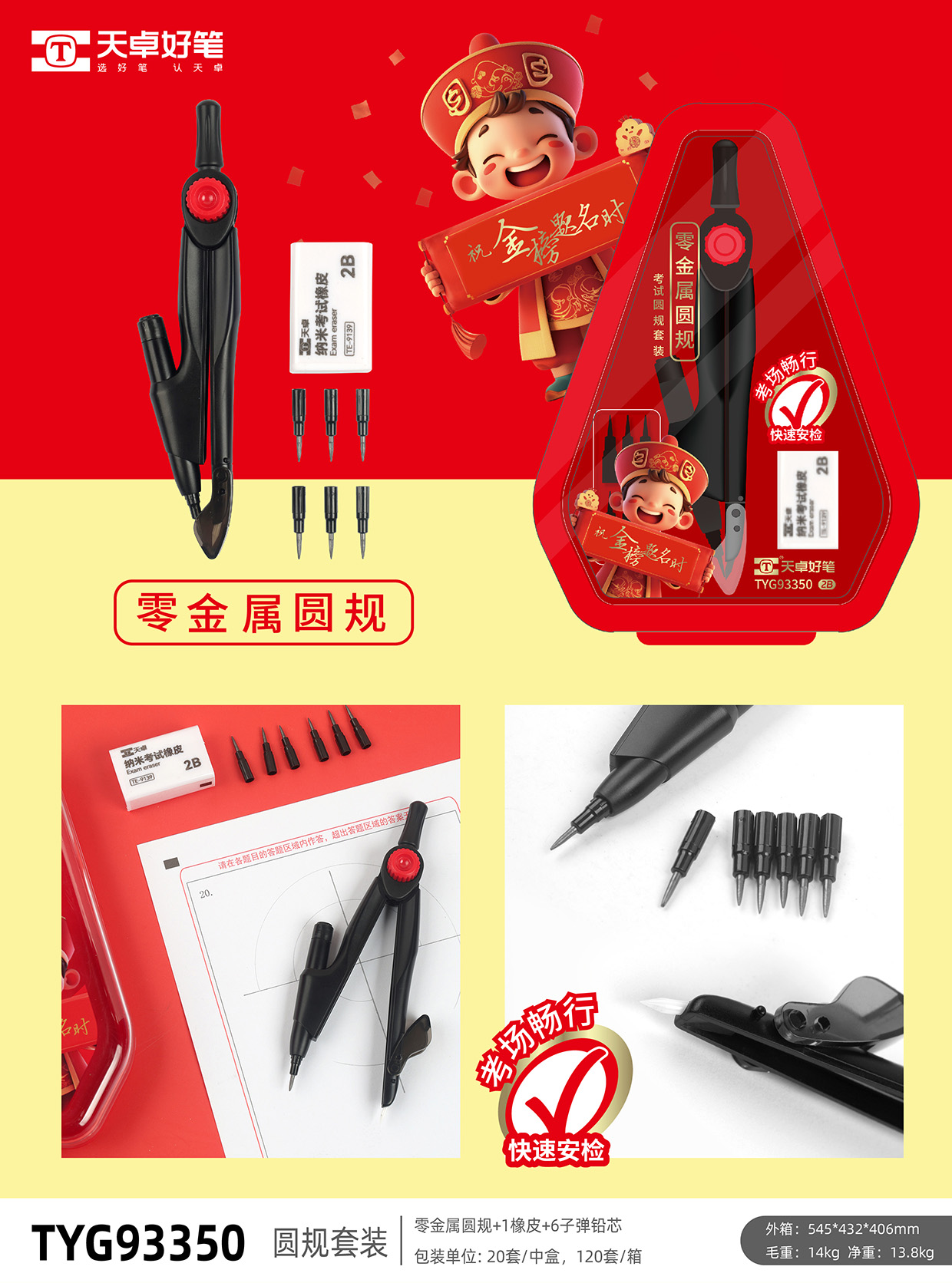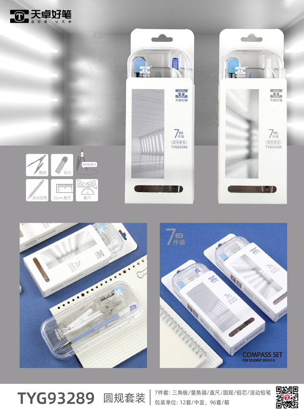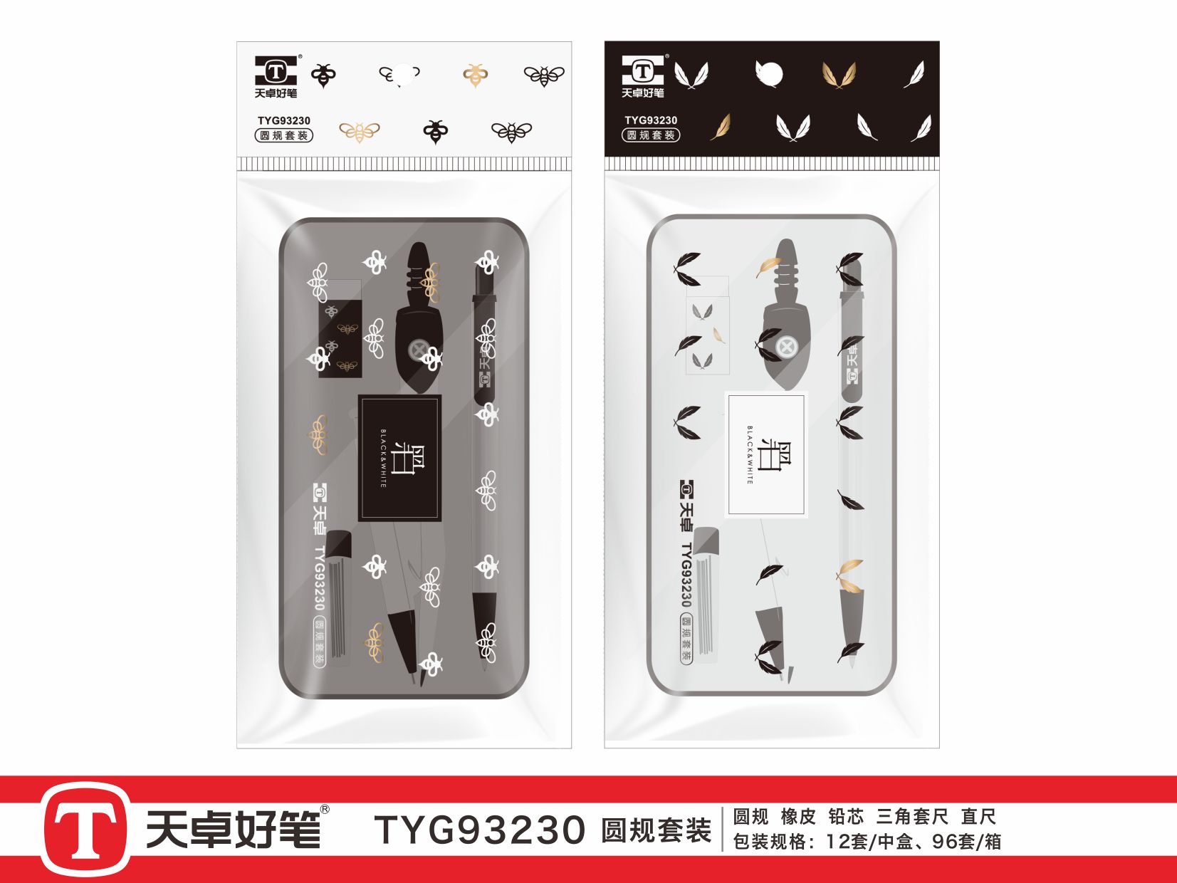TYG93230天卓 黑白 系列 圆规大套装,圆规、三角尺、橡皮擦、活动铅笔、铅芯,黑白金简约时尚图案。