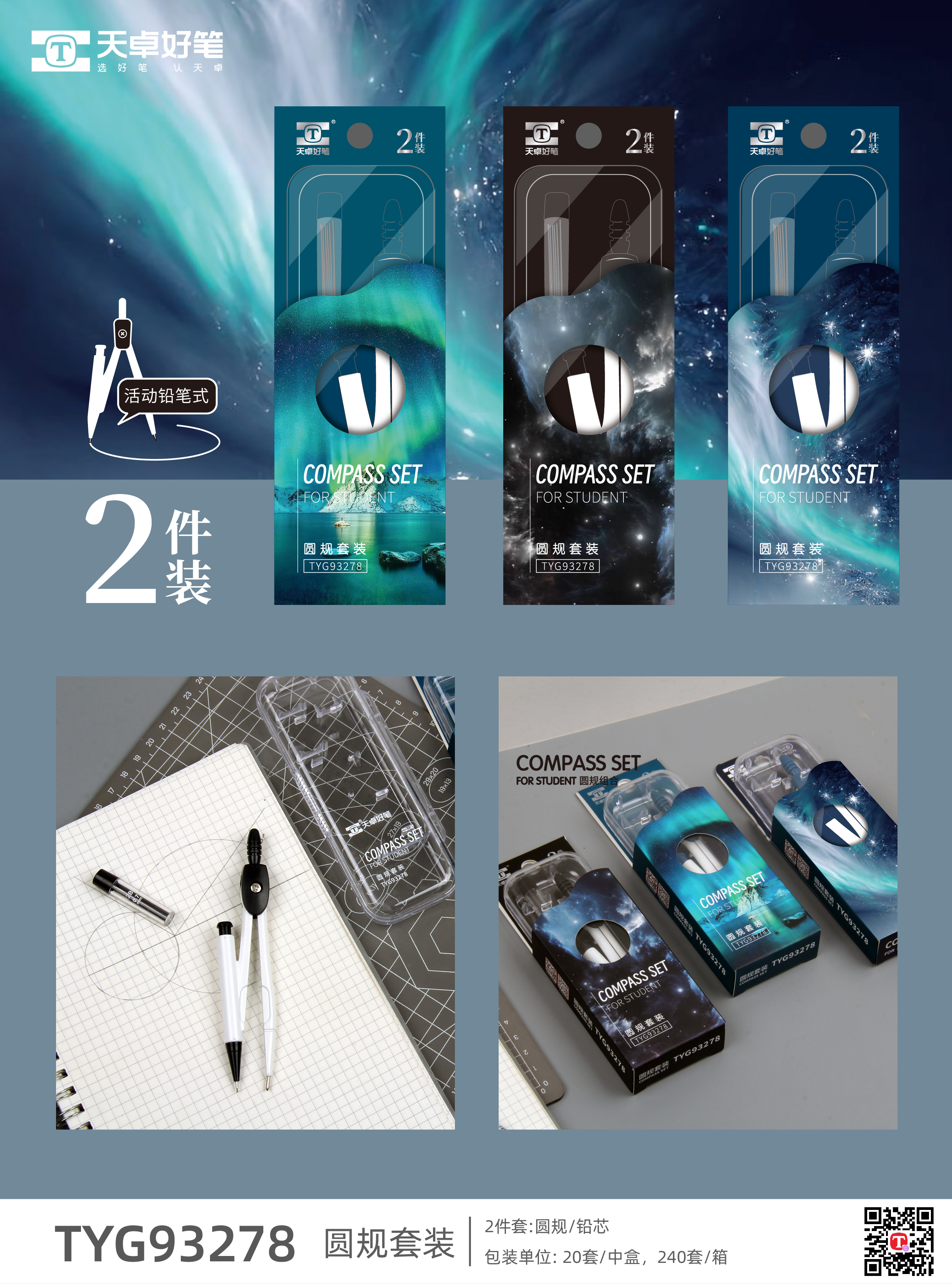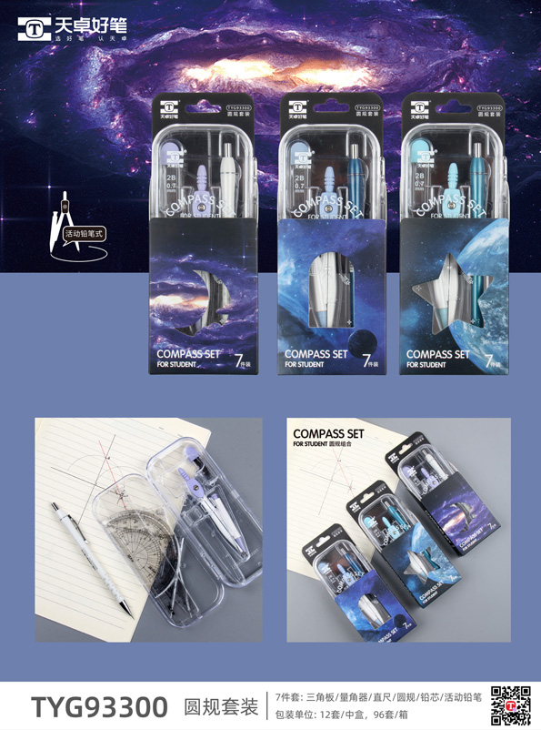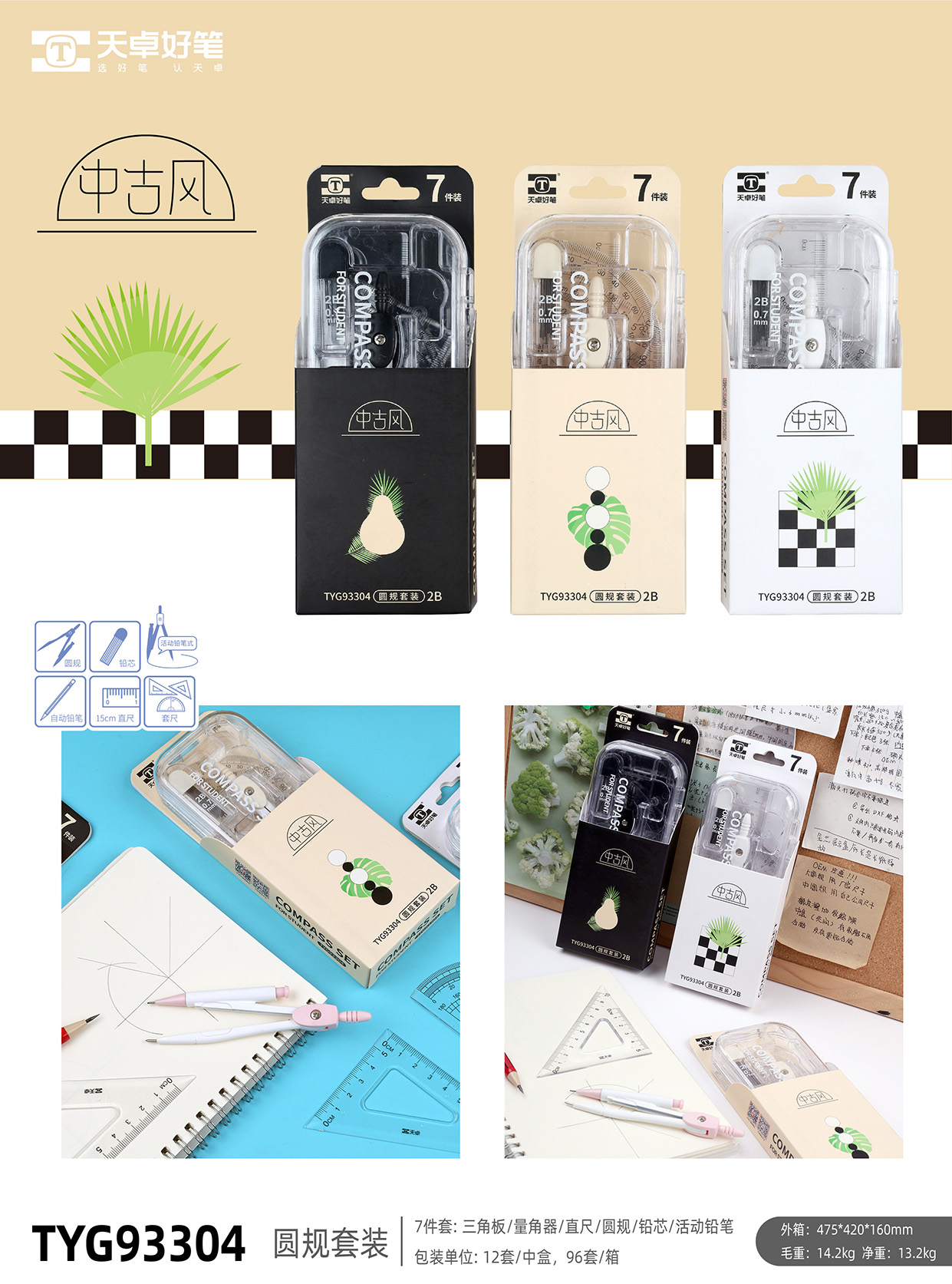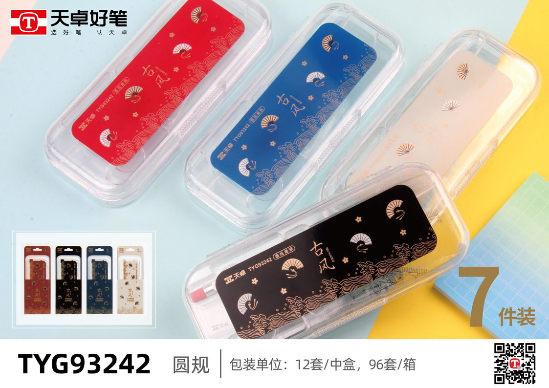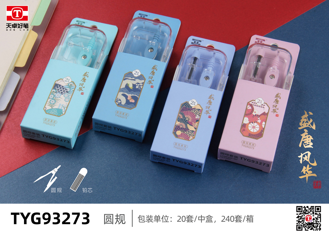 TYG93242天卓 古风系列 圆规中套装,圆规、三角尺、活动铅笔,中国古风主题图案